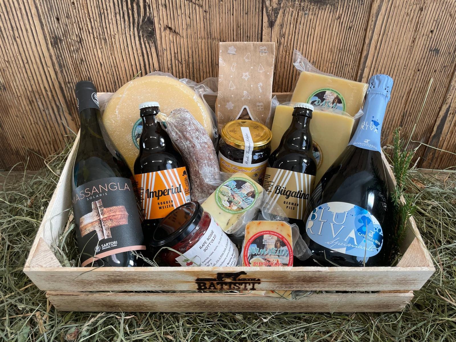 Formaggi di nostra produzione abbinati a prodotti tipici e confezionati nelle cassette in legno di abete, lavorate artigianalmente da noi.